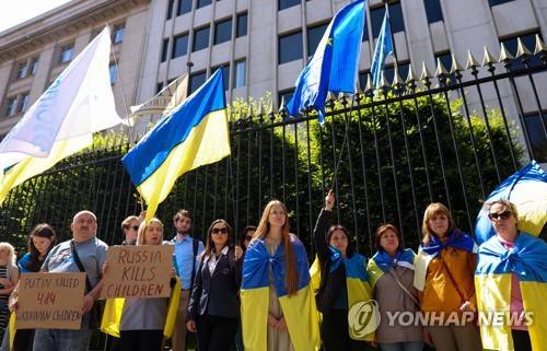 epa10668988 Ukrainian activists take part in a protest in front of the United Nations (UN) headquarters in Brussels, Belgium, 02 June 2023. The activists call to terminate Russia's membership in the UN Security Council and facilitate the establishment of a special tribunal to address Russia's crime of aggression. The NGO 'Promote Ukraine' reports that at least 484 children were killed during the war and estimates that between 150,000 to 300,000 children have been forcefully deported, constituting an undeniable act of genocide and a crime against humanity. EPA/OLIVIER HOSLET