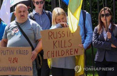epa10668996 Ukrainian activists take part in a protest in front of the United Nations (UN) headquarters in Brussels, Belgium, 02 June 2023. The activists call to terminate Russia's membership in the UN Security Council and facilitate the establishment of a special tribunal to address Russia's crime of aggression. The NGO 'Promote Ukraine' reports that at least 484 children were killed during the war and estimates that between 150,000 to 300,000 children have been forcefully deported, constituting an undeniable act of genocide and a crime against humanity. EPA/OLIVIER HOSLET
