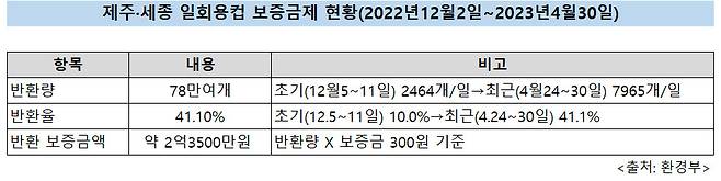 제주도와 세종시에서 일회용컵 보증금제가 시행된 지는 6개월이 됐지만, 아쉽게도 환경부가 현재 집계하고 있는 ‘통계’는 4월 30일까지뿐 입니다. 대신 이를 통해 시행 후 5개월 간의 ‘성적’을 확인할 수 있습니다.