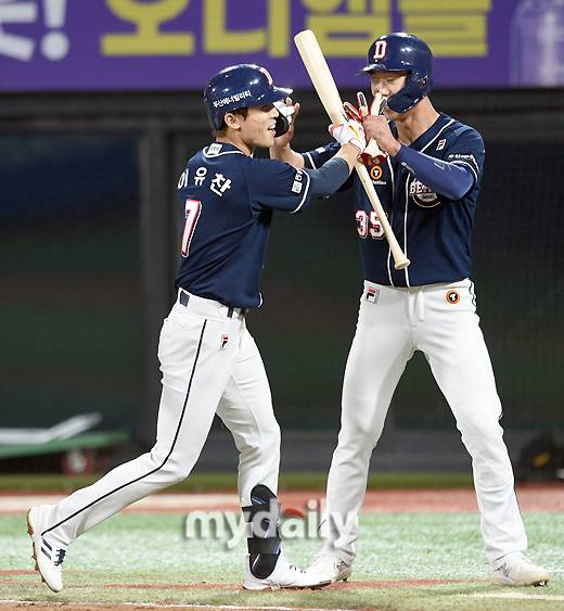 그런데 이유찬의 홈런은 좀 특별했다. 양의지, 양석환과는 달리 그는 홈을 밟으면서 자신의 홈런 배트를 소중히 챙겼다. 더그아웃에서 동료들의 축하를 받을 때도 배트를 놓치지 않았다.