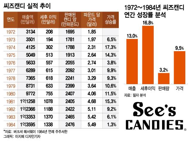 1972~1984년 기간 씨즈캔디의 연간 성장률을 분석해보면 판매량은 매년 3.2%밖에 안 늘었지만, 가격이 거의 10%씩 오르면서 매출액은 13%씩, 세후이익은 16.8%씩 눈덩이처럼 불어났습니다.
