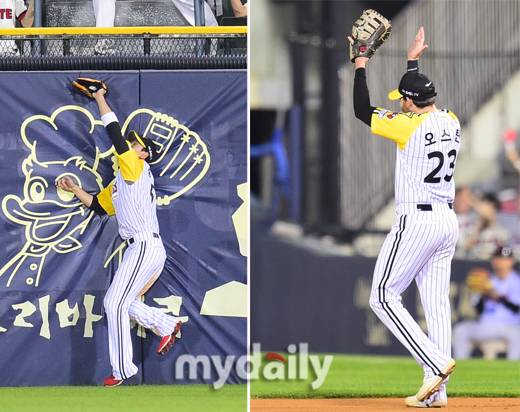 ▲홍창기가 펜스와 충돌하면서 수비를 하고 있다. 홍창기의 호수비에 박수치는 오스틴.