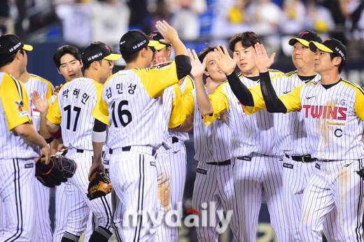 ▲6-1 승리로 위닝시리즈를 달성한 LG선수들이 하이파이브를 하고 있다.