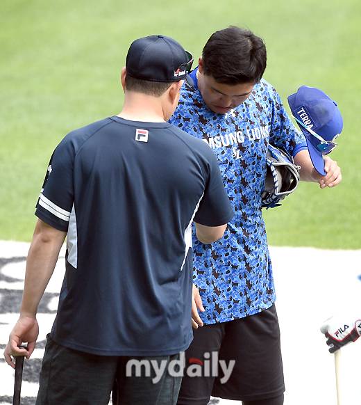 지난달 24일 서울 잠실야구장에서 진행된 '2023 신한은행 SOL KBO리그' 삼성 라이온즈와 두산 베어스의 경기가 시작되기 삼성 오재일이 그라운드에서 훈련 중인 두산 양의지와 인사했다. 양의지는 오재일을 보자마자 훈련복을 만지며 "안 어울린다"며 장난쳤고 오재일은 머리를 긁적이며 웃었다.