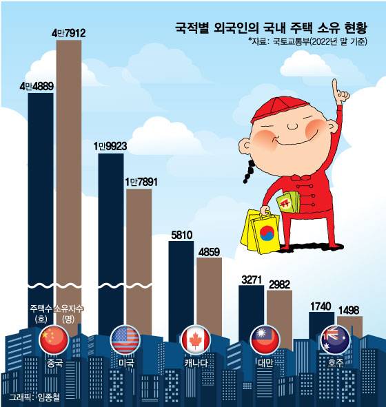국적별로 보면 중국인이 4만4889호에 달하는 국내 주택을 보유, 외국인 중 가장 많이 한국에서 집을 사들인 것으로 나타났다. 인원으로 보면 한국에 집을 가진 중국인은 4만7912명이었다.