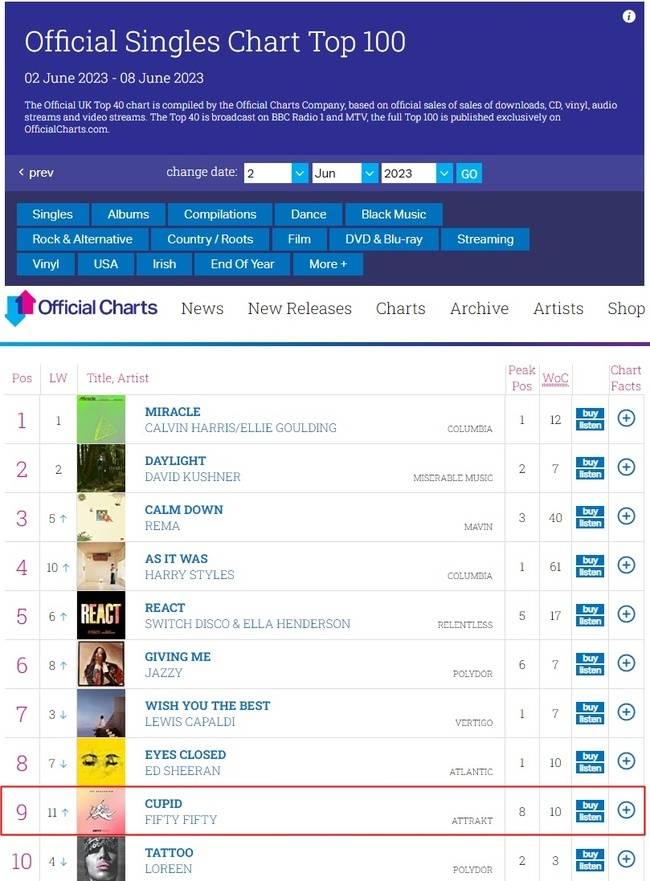 6월 2일 발표된 영국 ‘오피셜 싱글 차트 톱 100’에서 피프티 피프티의 ‘큐피드‘가 9위를 기록해 10주 이상 ‘오피셜 싱글 차트 톱 100’에 차트인 했으며, 2주만에 TOP 10에도 재진입했다.