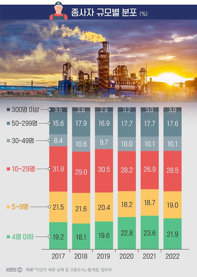 과거 추이를 알아보기 위해 < 이민자 체류실태 및 고용조사>가 처음으로 실시된 2017년부터 지난해까지 자료를 모두 살펴봐도 외국인 노동자 비중은 매년 3% 수준을 유지했습니다. 정부가 외국인 노동자 규모를 매년 조정하고 있기 때문입니다.