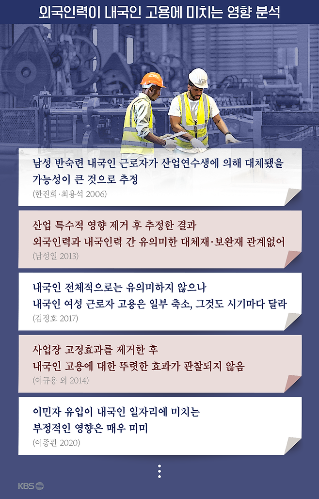 "외국인력이 내국인 일자리에 미치는 영향을 객관적으로 분석 하는 게 아주 어려워요. 또 연구 당시에는 공신력 있는 결과였다고 해도 노동시장이 계속 변하기 때문에 연구결과가 지금도 그대로 유용하다고 볼 수가 없거든요. 그래서 '대체'냐 '보완'이냐 하는 논쟁을 하기보다는 어떻게 하면 외국인력의 '보완성'을 강화하도록 제도를 설계할 것이냐, 그걸 논의 하는 게 훨씬 더 중요한 문제라고 생각합니다." - 이규용 한국노동연구원 선임연구위원