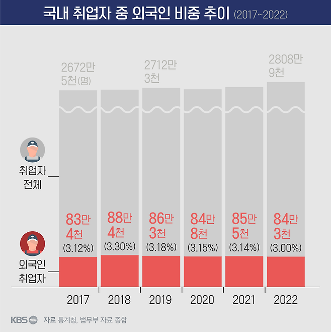 일단 우리나라에서 일하고 있는 외국인 규모는 지난해 기준으로 84만 3천여 명입니다. 같은 기간 내·외국인 전체 취업자 수가 2,808만 9천여 명이라는 점을 고려하면 외국인 노동자 수는 전체 취업자의 3% 수준입니다. (합법적 체류자 기준)