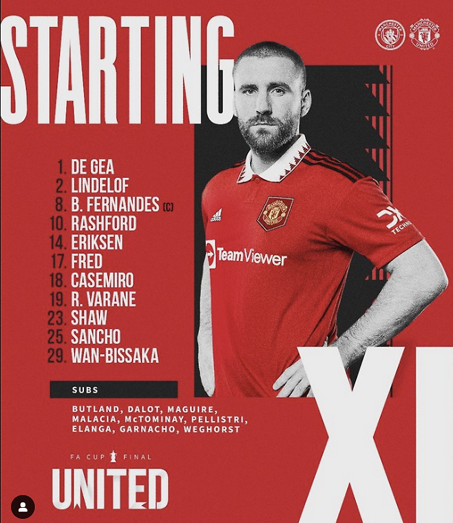 더블 볼란테는 프레드와 카세미루가 맡았으며 2선에 나서는 3명은 제이든 산초, 크리스티안 에릭센, 브루누 페르난데스로 낙점됐다. 원톱은 래시퍼드다. 래시퍼드가 주포지션은 왼쪽 날개지만 이번엔 스트라이커로 출전한다.