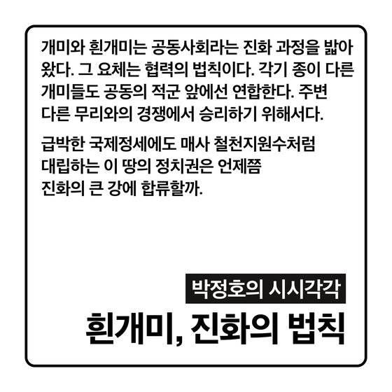 개미와 흰개미는 공동사회라는 진화 과정을 밟아 왔다. 그 요체는 협력의 법칙이다. 1980년대 중반 코스타리카 열대림에서 개미의 생태를 연구한 최 교수는 각기 종이 다른 개미들도 공동의 적군 앞에선 연합한다는 사실을 관찰했다. 독불장군 여왕개미가 여럿 모여 군집(colony)을 이루는 경우가 많았다. 주변 다른 무리와의 경쟁에서 승리하기 위해서다. 하물며 인간사는 어떻겠는가. 급박한 국제정세에도 매사 철천지원수처럼 대립하는 이 땅의 정치권은 언제쯤 진화의 큰 강에 합류할까. 틈만 나면 전 정권을 성토하고, 짬만 나면 현 정권을 비토하는 건 그 먼먼 옛날 개미들도 하지 않던 일이다. 진화란 협력과 공조의 또 다른 이름이기 때문이다.
