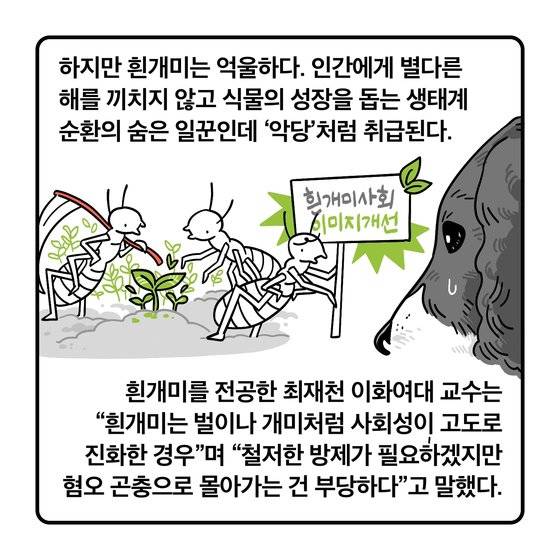 하지만 흰개미는 억울하다. 해충이란 딱지가 부담스럽다. 인간에게 별다른 해를 끼치지 않고 자연계에서도 지대한 역할을 하는데 ‘악당’처럼 취급된다. 흙 속 영양물질을 분해해 식물의 성장을 돕는 생태계 순환의 숨은 일꾼인데 말이다.