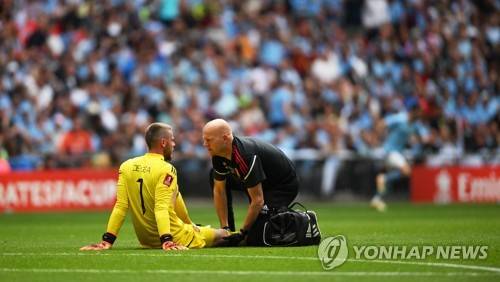 epa10670693 Goalkeeper David de Gea of Manchester United receives treatment during the FA Cup final soccer match between Manchester City and Manchester United, in London, Britain, 03 June 2023. EPA/DANIEL HAMBURY EDITORIAL USE ONLY. No use with unauthorized audio, video, data, fixture lists, club/league logos or 'live' services. Online in-match use limited to 120 images, no video emulation. No use in betting, games or single club/league/player publications.