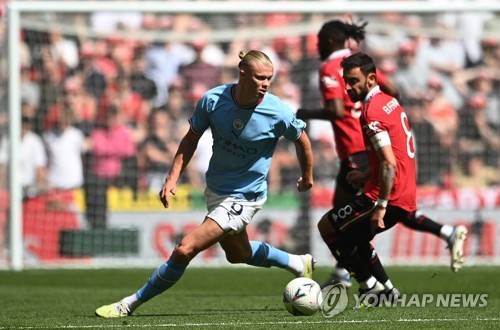 epa10670674 Erling Haaland (L) of Manchester City and Bruno Fernandes (R) of Manchester United in action during the FA Cup final soccer match between Manchester City and Manchester United, in London, Britain, 03 June 2023. EPA/ANDY RAIN EDITORIAL USE ONLY. No use with unauthorized audio, video, data, fixture lists, club/league logos or 'live' services. Online in-match use limited to 120 images, no video emulation. No use in betting, games or single club/league/player publications.