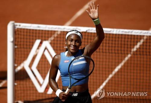 epa10670663 Coco Gauff of the United States celebrates winning against Mirra Andreeva of Russia in their Women's Singles third round match during the French Open Grand Slam tennis tournament at Roland Garros in Paris, France, 03 June 2023. EPA/YOAN VALAT