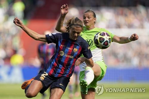 Wolfsburg's Alexandra Popp vies for the ball with Barcelona's Irene Paredes, left, during the Women's Champions League final soccer match between FC Barcelona and VfL Wolfsburg at the PSV Stadion in Eindhoven, Netherlands, Saturday, June 3, 2023. (AP Photo/Martin Meissner)