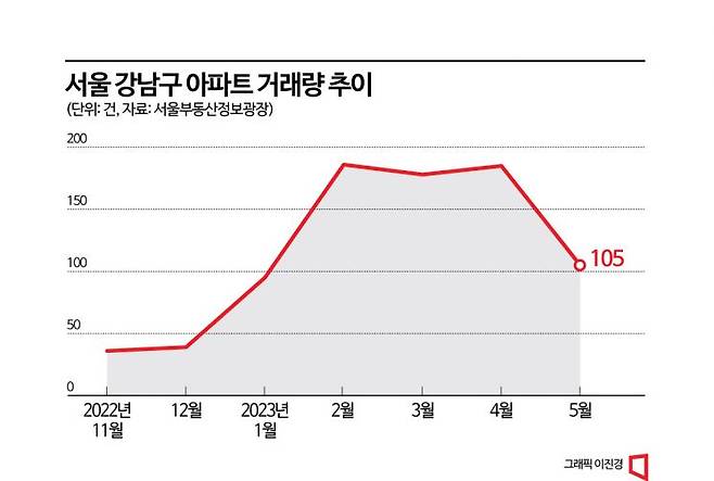 이로써 강남구 거래량은 지난 2월부터 5월까지 4개월 연속 100건을 넘어서게 됐다.