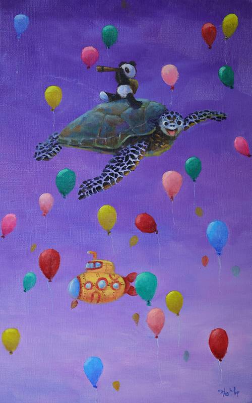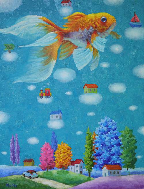임 화가의 여섯 번째 전시회 ‘꿈을 꾸다’의 작품들이다. 금붕어가 어항에서 나와 공중을 유영하는 모습 등 굴레에서 벗어나 자유롭고 싶은 마음이 담겨 있다.