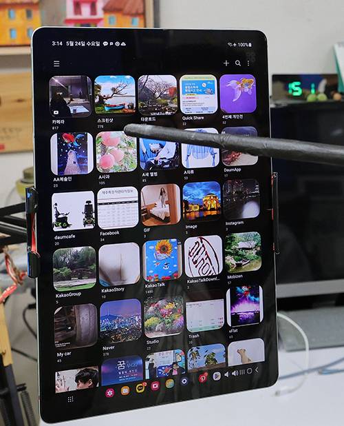 임 화가가 태블릿 PC로 사진을 보며 그림 아이디어를 얻고 있다.