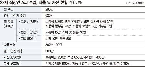 32세 A씨 월 수입은 280만원이다. 연간 비정기 수입으로는 620만원이 잡힌다. 월 지출은 200만원이다. 고정비는 보장성 보험료(18만원), 휴대폰비(5만원), 학자금 대출(30만원), 자동차 할부금(23만원), 자동차 보험료(6만원), 기부금(3만원) 등을 포함해 85만원이다. 변동비는 교통비(15만원)와 식비 및 용돈(40만원)을 합친 55만원이다. 저축은 청약(10만원), 적금(50만원) 등 60만원씩 하고 있다. 이와 별개로 50만~100만원은 자유저축을 하고 있다. 자산은 1530만원이다. 보통예금(250만원), 적금(850만원), 주택청약(430만원) 등이 있다. 부채는 학자금 대출금(1100만원), 자동차 할부잔액(720만원), 신용카드 할부금(180만원) 등 2000만원이다.