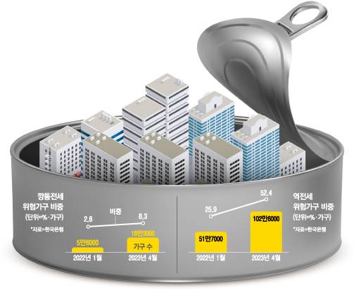 4일 한국은행의 깡통전세·역전세 현황 및 시사점 자료에 따르면 지난해 이후 주택시장이 하락세를 이어가면서 잔존 전세계약 중 깡통전세 위험가구 비중은 지난해 1월 2.8%(5만6000호)에서 올해 4월 8.3%(16만3000호)로 3배가량 증가한 것으로 나타났다. 역전세 위험가구 비중도 같은 기간 25.9%(51만7000호)에서 52.4%(102만6000호)로 1년3개월만에 2배로 늘어났다.