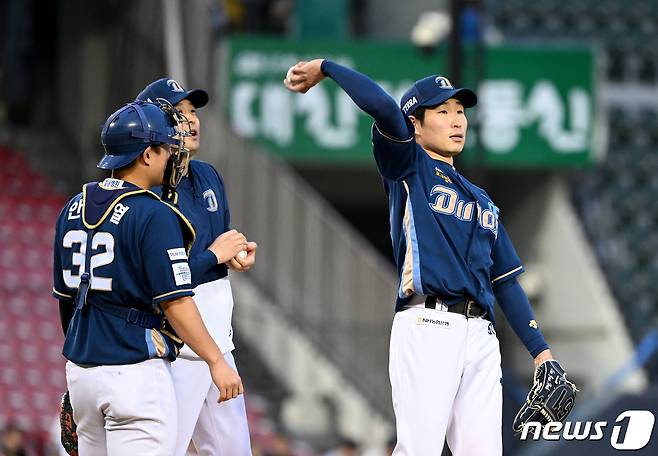 (서울=뉴스1) 장수영 기자 = 4일 오후 서울 송파구 잠실야구장에서 열린 2023 신한 SOL KBO리그 NC 다이노스와 LG 트윈스의 경기 7회말 NC 선발 이재학이 볼넷과 사구로 주자를 허용한 뒤 마운드에서 내려오고 있다. 2023.6.4/뉴스1