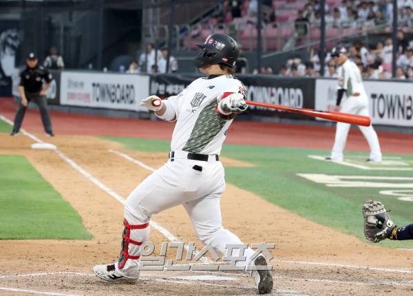 kt 박병호가 6회 1타점 적시타를 날리고있다.