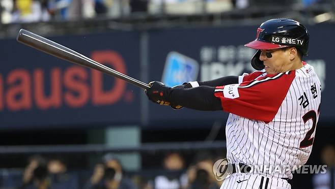 (서울=연합뉴스) 김성민 기자 = 4일 오후 서울 잠실야구장에서 열린 2023 프로야구 NC 다이노스와 LG 트윈스의 경기. 7회말 1사 2,3루 LG 김현수가 1타점을 올리는 진루타를 치고 있다. 이번 타석에서 김현수는 통산 1,300타점 기록을 세웠다. 2023.6.4
