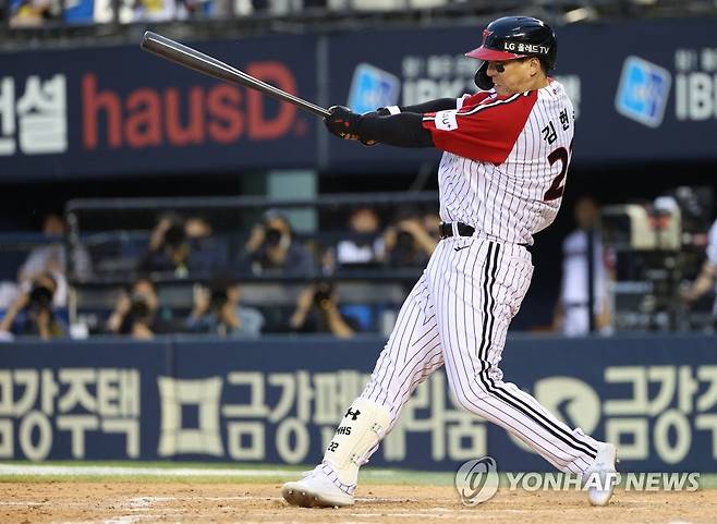 (서울=연합뉴스) 김성민 기자 = 4일 오후 서울 잠실야구장에서 열린 2023 프로야구 NC 다이노스와 LG 트윈스의 경기. 7회말 1사 2,3루 LG 김현수가 1타점을 올리는 진루타를 치고 있다. 이번 타석에서 김현수는 통산 1,300타점 기록을 세웠다. 2023.6.4