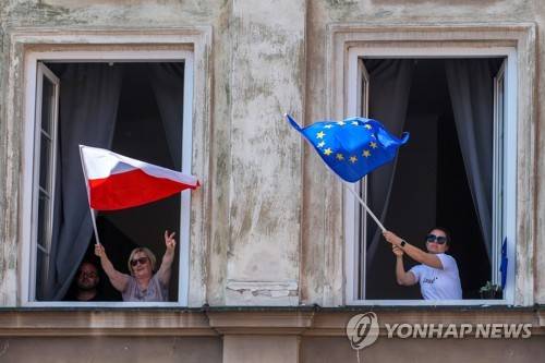 epa10672556 People wave the EU and Polish flags as supporters and members of opposition parties take part in the '4th June March' in Warsaw, Poland, 04 June 2023. The opposition march, held on the 34th anniversary of the first partial-free elections in Poland, is to protest against Polish government policies. EPA/Pawel Supernak POLAND OUT