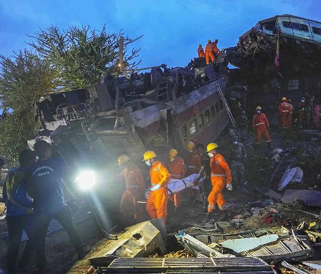종잇장처럼 구겨진 열차 2일(현지 시간) 인도 동부 오디샤주 발라소르에서 달리던 여객열차가 주차된 화물열차에 부딪혀 탈선한 후 몇 분 뒤 반대 방향에서 달리던 여객열차와 또 충돌했다. 3일 사고 현장에서 구조대원과 주민들이 겹겹이 쌓인 객차 잔해를 뒤지며 구조 작업을 벌이고 있다. 이 사고로 4일 현재 최소 275명이 숨지고 1175명이 다쳤다. 2차 충돌한 여객열차에 타고 있던 한 승객은 “멀리서 무언가를 긁는 듯 끔찍한 소리가 들리더니 곧이어 타고 있던 객차가 90도로 땅에 기울어져 멈췄다”며 “열차 밖으로 나오니 사방에 핏자국과 시신들이 보였다”고 AFP통신에 말했다. 발라소르=AP 뉴시스