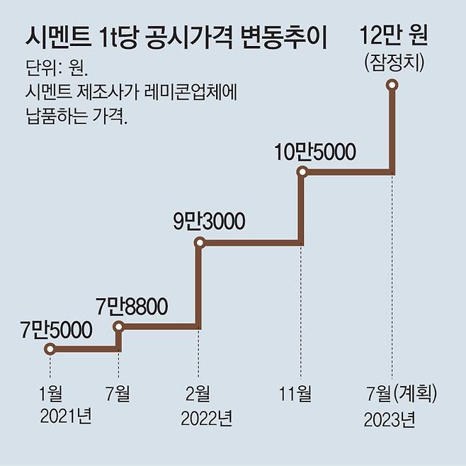 반면 레미콘업계와 건설업계는 시멘트 제조 원가의 30∼40%를 차지하는 유연탄 가격이 급락했기 때문에 가격 인상은 부당하다는 입장이다. 한국수입협회 국제원자재가격정보에 따르면 국내 시멘트업체가 주로 수입하는 호주 유연탄 t당 가격은 지난달 말 기준 135달러로 지난해 9월 말 436달러 대비 3분의 1 수준으로 하락했다. 중대형 건설사 구매 담당 실무자들이 모인 대한건설자재직협의회(건자회) 시멘트 담당 관계자는 “지난해 유연탄 가격이 크게 올랐을 때는 (가격 인상을) 그나마 이해할 수 있었지만 이번엔 받아들일 수 없다”고 했다. 시멘트 회사들은 2021년 6월 t당 가격을 7만5000원에서 7만8800원으로 올린 이후 꾸준히 가격을 올려왔다. 지난해에는 2월 9만3000원(18%), 9월 10만5000원(14%)으로 인상했다. 다음 달 t당 가격이 12만 원 수준으로 오르면 2년 새 60% 인상되는 셈이다.