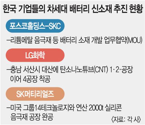 이에 한국 소재 업체들은 전기차 배터리의 주행거리를 늘릴 수 있는 신소재 개발에 팔을 걷어붙였다.