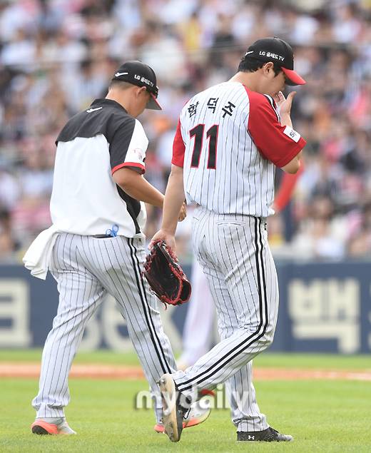 문제는 여기서였다. 팔꿈치에 문제가 생긴 듯 했다. 김주원에게 5구째 공을 던지고 이상을 감지했다. 더 이상 공을 던지기 못했다. 주심이 올라와 상태를 확인한 뒤 LG 벤치 쪽에 사인을 보냈다. 트레이너가 올라와 상태를 체크했고, 결국 마운드에서 물러났다.