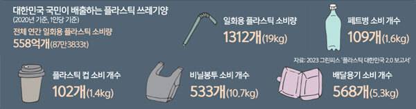 우리나라 역시 자유롭지 못하다. 지난 3월 발간된 환경단체 그린피스의 ‘플라스틱 대한민국 2.0 보고서’를 살펴보면 2020년 기준 국민 1인당 연간 약 19.0㎏의 플라스틱을 소비했다. 생수 페트병 109개(1.6㎏), 일회용 플라스틱컵 102개(1.4㎏), 일회용 비닐봉투 533개(10.7㎏), 일회용 플라스틱 배달용기 568개(5.3㎏)에 해당하는 양이다.