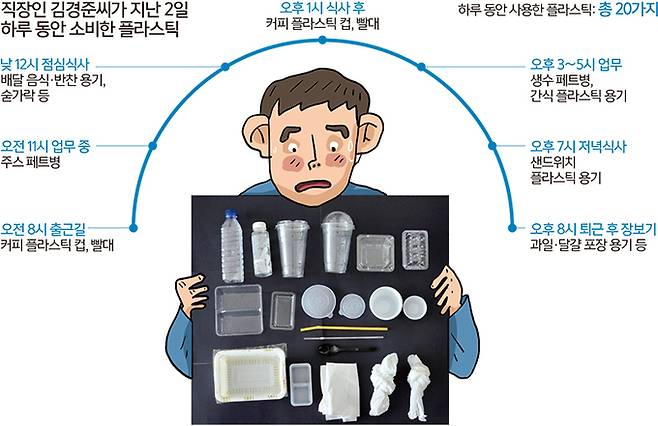 직장인 김경준(26)씨의 하루는 플라스틱으로 시작해서 플라스틱으로 끝난다. 2일 오전 8시 바쁜 출근길에도 김씨가 빼놓지 않는 건 매일 아침 마시는 커피다. 김씨는 음료가 담긴 플라스틱 컵과 빨대를 챙겨 회사 건물 안으로 들어갔다.
