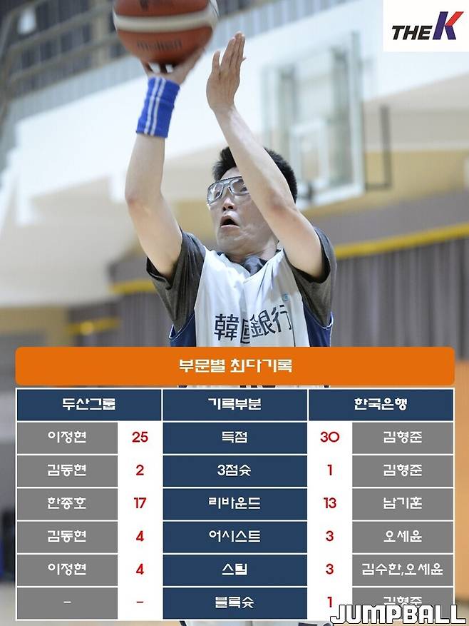 한국은행은 4일 서울 관악구 인근 체육관에서 열린 EVISU SPORTS배 2023 The K직장인농구리그(www.kbasket.kr) 1차대회 그룹 1 C조 순위전에서 김형준(4리바운드)이 개인 최다 30점을 몰아쳤고, 김건(10점 8리바운드), 장석환(8점 7리바운드)이 알토란같은 활약을 펼친 데 힘입어 두산그룹을 64-55로 잡았다.