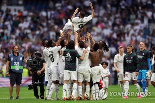 경기 후엔 벤제마를 비롯해 이번 시즌을 끝으로 레알을 떠나는 선수들이 헹가래를 받으며 레알에서의 생활을 마무리 지었다.