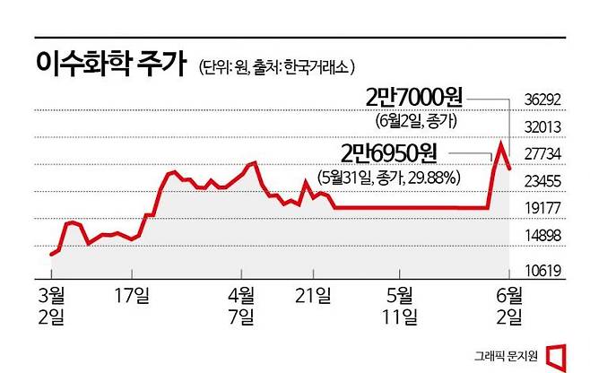 이수화학은 분할을 결정한 뒤 5월27일부터 거래가 정지됐다가 5월31일 거래가 재개됐습니다.