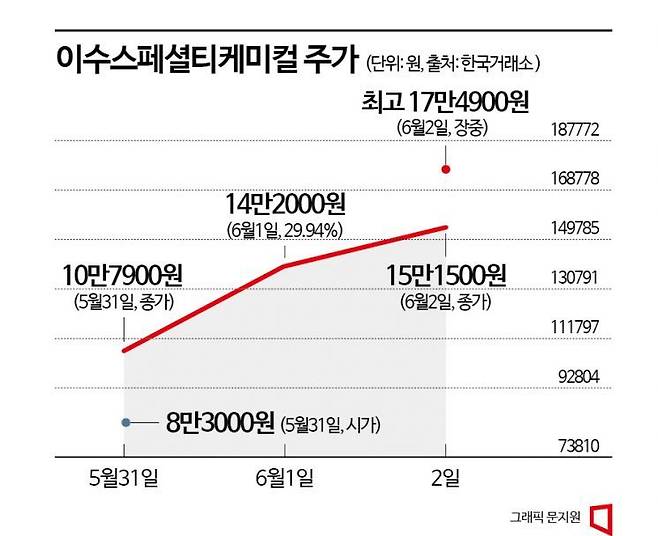 특히 이수스페셜티케미컬은 상장 다음날인 6월1일에도 개장하자마자 상한가(29.94%)를 기록하며 시가와 종가 모두 14만200원을 나타냈습니다.