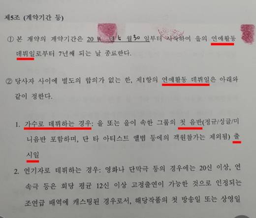 2. 전속계약의 종료일을 (전속계약일부터가 아니라) '연예활동 데뷔시'로부터 기산하는 것은, 소속사의 자의에 따라 장기가 결정되는 초장기의 전속계약을 정하는 것으로 불공정성이 이미 확인되었는데도, SM은 여전히 공정위의 시정조치를 따르지 않고 있습니다.