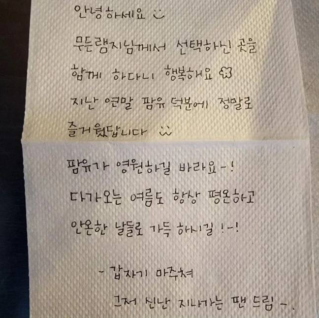 편지에는 ‘안녕하세요. ‘무든램지’님께서 선택하신 곳을 함께 하다니 행복해요. 지난 연말 팜유 덕분에 정말로 즐거웠답니다. 팜유가 영원하길 바라요! 다가오는 여름도 항상 평온하고 안온한 날들로 가득하시길’이라고 적혔다.