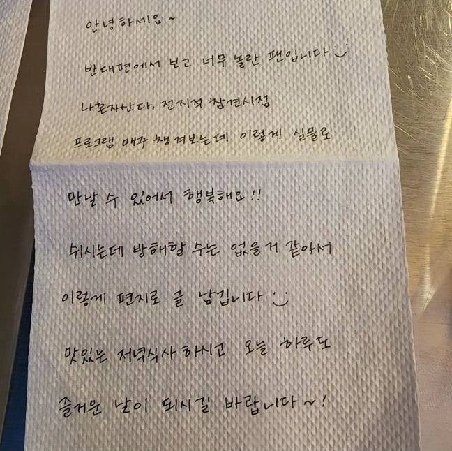 또, 다른 편지에는 ‘안녕하세요. 반대편에서 보고 너무 놀란 팬입니다. ‘나 혼자 산다’, ‘전지적 참견 시점’ 프로그램 매주 챙겨보는데 이렇게 실물도 만날 수 있어서 행복해요! 쉬시는 데 방해할 수 없을 거 같아서 이렇게 편지로 글 남깁니다. 맛있는 저녁 식사하시고오늘 하루도 즐거운 날이 되시길 바랍니다’라고 있는 것을 볼 수 있다.