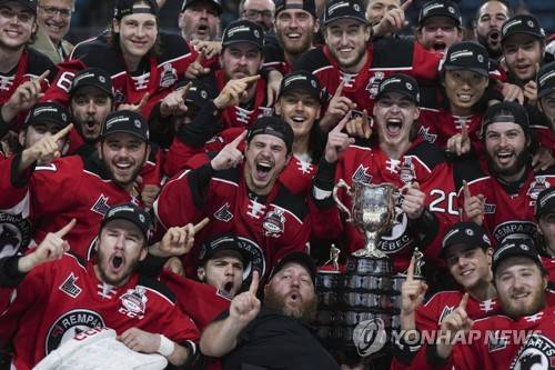 The Quebec Remparts celebrate with the CHL Memorial Cup after Quebec defeated the Seattle Thunderbirds during CHL Memorial Cup final hockey action, Sunday, June 4, 2023, in Kamloops, British Columbia. (Darryl Dyck/The Canadian Press via AP) MANDATORY CREDIT