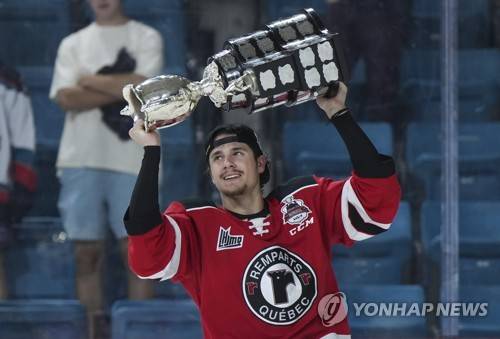 Quebec Remparts' James Malatesta hoists the CHL Memorial Cup after Quebec defeated the Seattle Thunderbirds during CHL Memorial Cup final hockey action, Sunday, June 4, 2023, in Kamloops, British Columbia. (Darryl Dyck/The Canadian Press via AP) MANDATORY CREDIT
