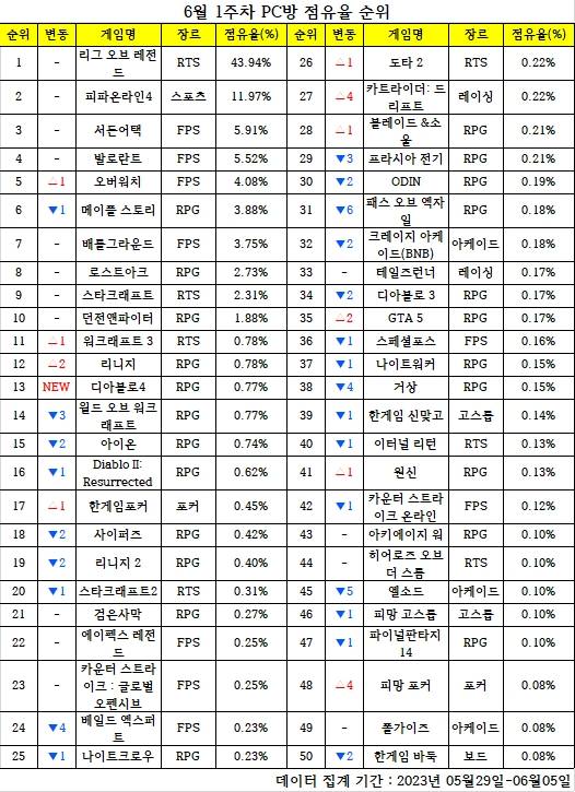 [PC방순위] 디아블로4, 13위로 데뷔…PC방 판도 바꾸나?