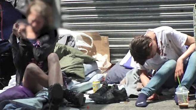 그런데 옆을 보시면 이렇게 시민들 사이에 약에 취한 사람들이 아무렇지 않게 섞여 있는 모습을 볼 수 있습니다.
