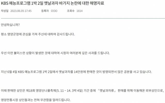 영양군은 "6월 4일 KBS 예능프로그램 '1박 2일'에서 옛날과자를 14만원에 판매한 것이 방영되면서 많은 공분을 사고 있다"며 "이때 판매한 상인은 제18회 영양산나물축제 기간에 '옛날 과자류' 판매를 위해 이동해 온 외부 상인으로, 영양전통시장 상인들과는 전혀 무관함을 알려드린다"고 밝혔다.