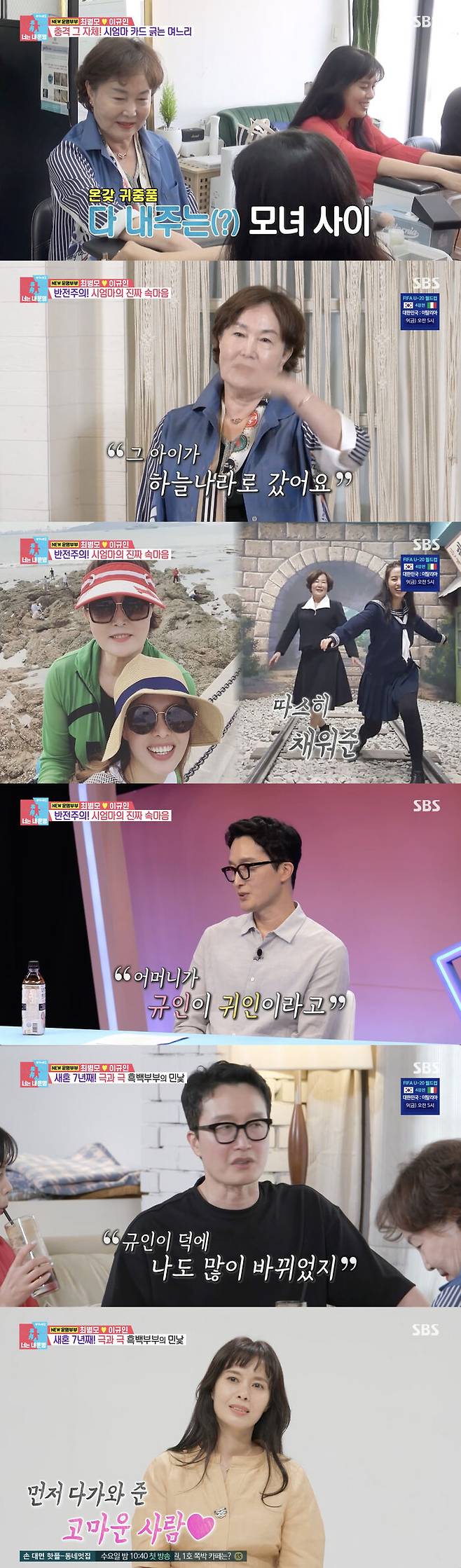 이어 그는 "병원비를 감당하느라 병모를 이웃집에 맡기고 일을 하러 다녔다. 그래서 병모가 고생이 많았다. 그래서 더 내성적인 성격이 된 거 같기도 해서 너무 미안하다"라고 했고, 최병모는 "엄하게 키운 어머니에게 어색하고 서운한 감정이 있었다. 그런데 와이프가 중간에서 역할을 잘해줘서 어색한 감정이 많이 없어졌다"라고 아내에게 고마움을 전했다.