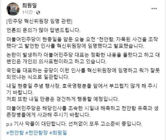 최 전 함장은 이 위원장이 임명된 직후 페이스북에서 이재명 대표를 겨냥해 “현충일 선물 잘 받았다”며 “오늘까지 입장 밝혀주시고 연락 바란다. 해촉 등 조치 연락이 없으면 내일 현충일 행사장에서 천안함 유족과 생존 장병들이 찾아뵙겠다”고 압박했다. 최 전 함장은 페이스북에 재차 올린 다른 글에서 “논란이 발생하자 민주당 대표는 정확한 내용을 몰랐다고 하고, 대변인은 개인의 의사 표현이라고 하고 있다”며 “국민을 대표하는 공당이 이런 인사를 혁신위원장에 임명하고 뭐가 잘못됐냐는 식으로 일관한다”고 비판했다. 그러면서 “민주당은 해당 인사를 조속한 시일 내 해촉하고 천안함 유족과 생존 장병들에게 사과해달라”고 촉구했다.